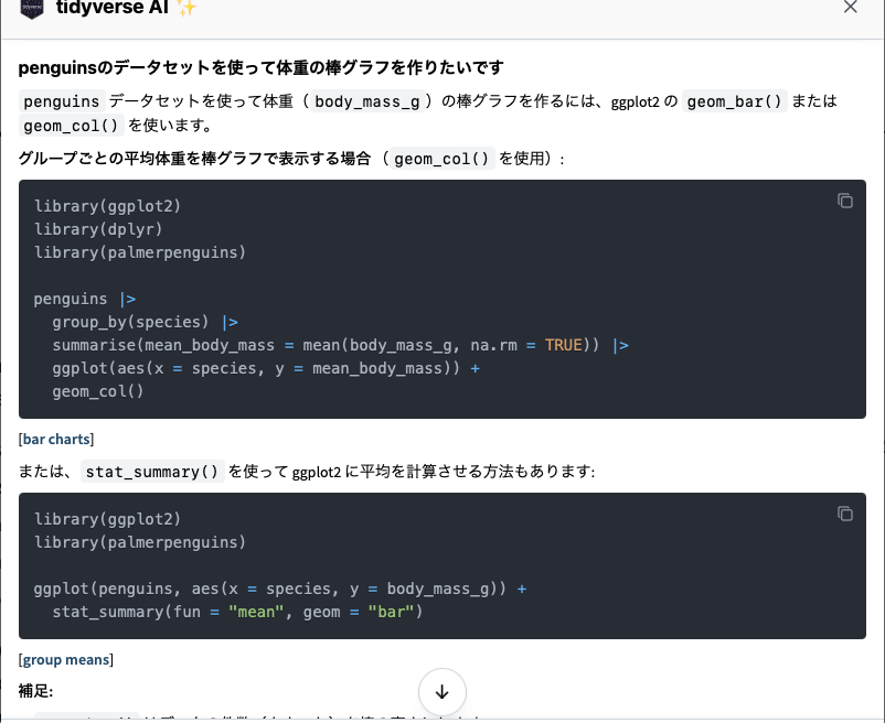 library(tidyverse)というコードの有無| species | island | bill_len | bill_dep | flipper_len | body_mass | sex | year |